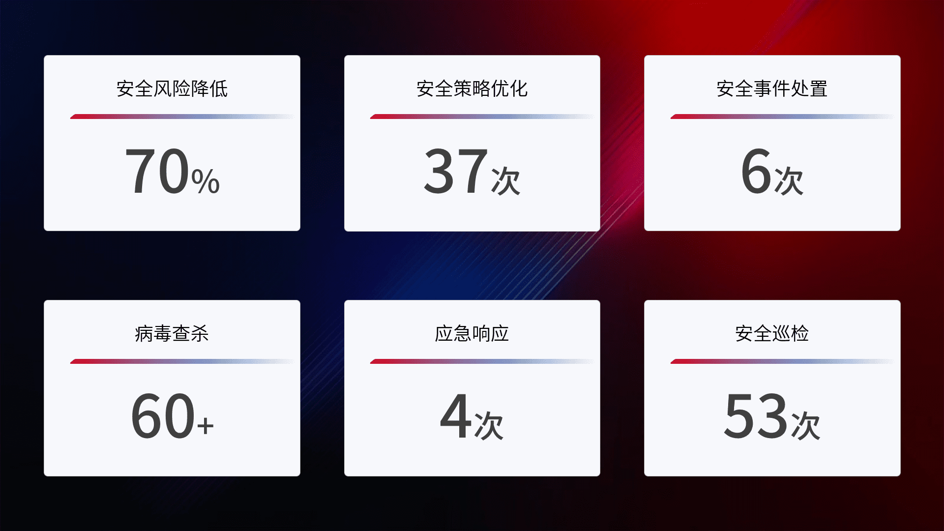 提供全面的安全事件报告体系,,,包括处置报告、、、周报、、、季度和年度总结,,,结合持续监控,,,帮助客户深入了解网络安全状况。。。。