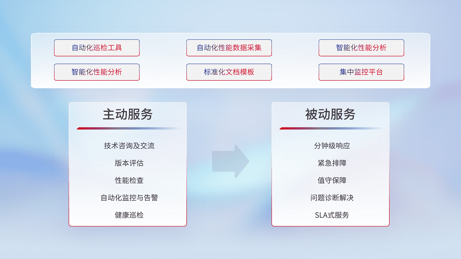 智能化工具和标准化文档,,保障服务质量,,提供主动服务(包含技术咨询、、、、版本评估、、性能检查、、、自动化监控与告警、、、健康巡检)和被动服务包含(分钟级响应、、紧急排障、、、值守保障、、问题诊断解决、、、SLA服务)。。
